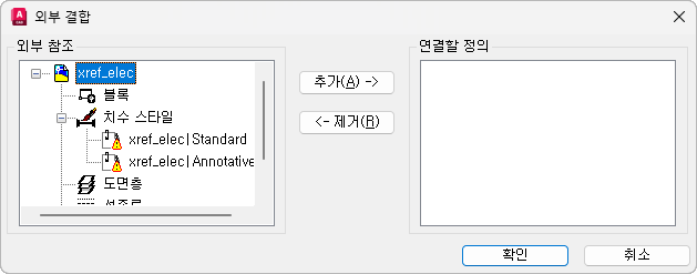 외부 참조 리스트에서 선택한 명명된 객체 정의를 연결할 정의 리스트로 이동합니다.
