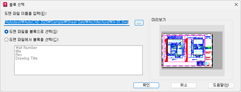 지정된 전체 도면 파일 또는 도면 템플릿 파일을 블록 정의로 사용합니다.