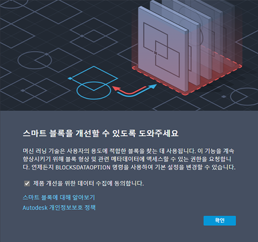 블록 교체 또는 블록 변환 기능을 처음 사용할 때 블록 데이터에 대한 액세스를 요청하는 동의 대화상자가 표시됩니다. 컨텐츠 데이터를 공유하면 AutoCAD에서 블록 제안 및 기타 기능을 개선하는 데 도움이 됩니다. 그러나 제품 개선을 위해 데이터를 공유하지 않는 경우에도 스마트 블록을 계속 사용할 수 있습니다.