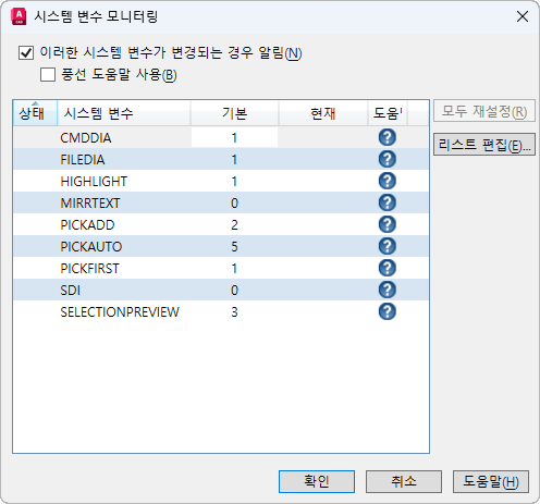 - 시스템 변수 리스트 편집 대화상자를 표시합니다.