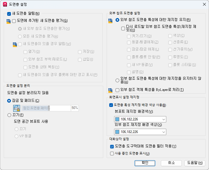 새 도면층에 대해 알림이 수행되는 시기, 일부 도면층이 격리된 경우의 도면층 동작, 도면층 필터가 도면층 도구막대에 적용되는지 여부, 그리고 도면층 특성 관리자에서 뷰포트 재지정의 배경 색상을 조정합니다.