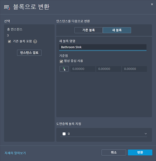 원본 객체 또는 선택한 인스턴스를 새 블록으로 변환할 수도 있습니다. 변환 대화상자에서 블록 이름 및 삽입점을 지정하여 새 블록을 정의합니다. 기본적으로 삽입점은 선택한 형상의 중심으로 설정됩니다.