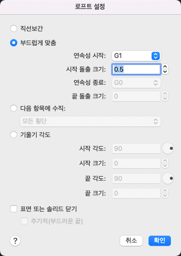 로프트 표면 및 해당 횡단면의 윤곽선을 조정합니다. 또한 표면이나 솔리드를 닫을 수 있습니다.