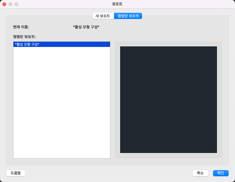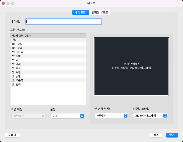 새 뷰포트 구성을 작성하거나 모형 공간 뷰포트 구성을 명명하고 저장합니다.