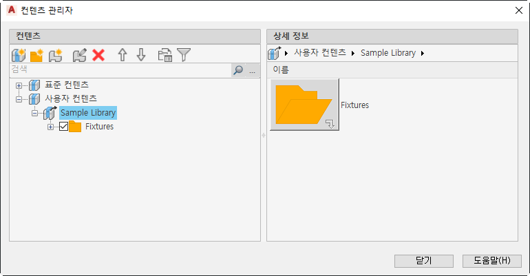 AMCONTENTMANAGER 명령을 실행하면 컨텐츠 관리자 대화상자가 표시되며, 이 대화상자에는 컨텐츠 라이브러리를 작성하고 관리하는 데 사용되는 여러 도구가 포함되어 있습니다.
