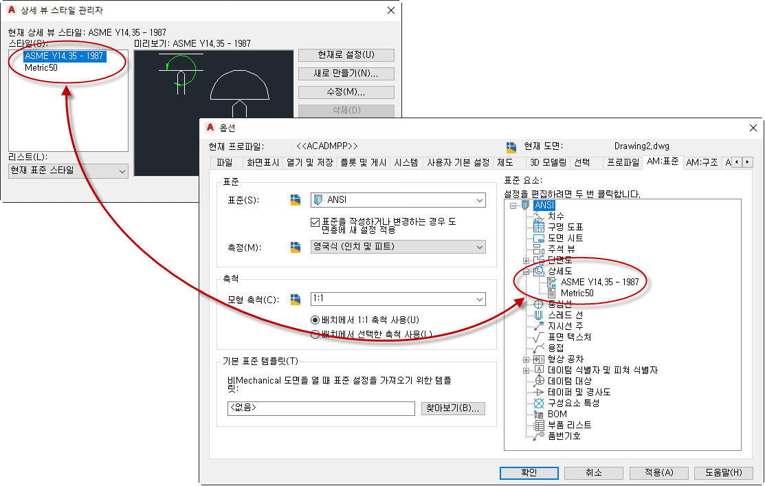 AutoCAD Mechanical 도구 세트 상세도 스타일만 제도 표준의 마스터 설정에서 문자 및 지시선 설정을 상속할 수 있습니다.