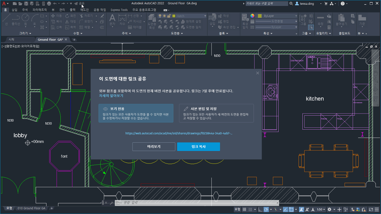AutoCAD 웹 앱에서 보거나 편집할 현재 도면의 사본에 대한 링크를 공유합니다. 관련된 모든 DWG 외부 참조 및 이미지가 포함되어 있습니다.