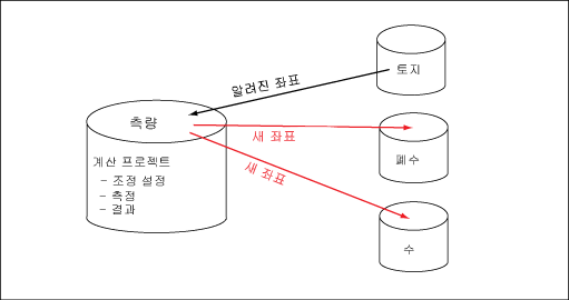 측량 모듈에서는 측정, 계산 설정 및 결과가 별도의 데이터베이스 스키마에 저장됩니다. 조정 계산에 필요한 제어점은 서버의 모든 산업 모형에 저장할 수 있습니다. 또한 새 좌표도 서버의 모든 산업 모형에 분산할 수 있습니다.