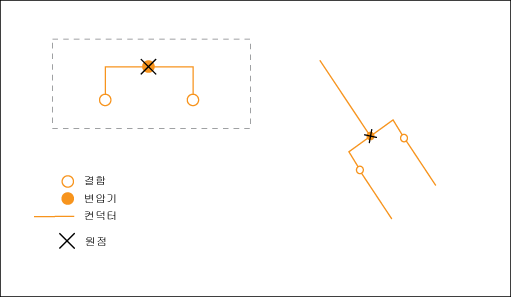 예 - 전기 피쳐 배열을 위한 이 템플릿은 변압기, 두 개의 접합 및 두 개의 컨덕터로 구성됩니다. 이 템플릿을 사용하여 5개의 객체를 인스턴스화하고 마우스 클릭 한 번으로 객체의 속성 및 연결성을 적용할 수 있습니다. 템플릿은 그룹화되고, 단일 도면요소로 배치하고 이동할 수 있습니다. 그런 다음 계속해서 컨덕터를 디지타이즈할 수 있습니다.
