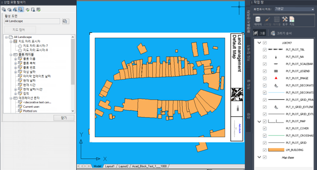 - 토지 관리 데모 덤프를 가져오고 산업 모형 이름을 PLOT_ACADBLOCKS로 지정했습니다. 그리고 해당 산업 모형에 대한 플롯 확장을 활성화했습니다.