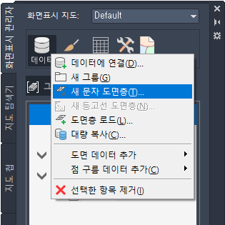 도면작성 도면층 작성 방법과 동일한 방식으로 화면표시 관리자에서 문자 도면층을 작성합니다.