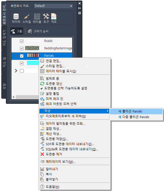 AutoCAD Map 3D 툴셋의 각 항목에는 현재 해당 항목에 사용할 수 있는 명령이 포함된 사용자 메뉴가 있습니다.