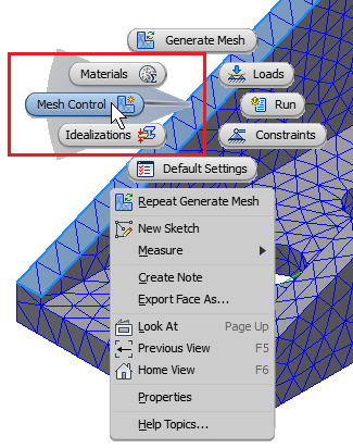 리본이나 모델 트리로 이동하는 대신 Inventor Nastran 명령 중 아무것이나 클릭하면 해당하는 대화상자가 열립니다. 예를 들어 모델에서 면을 선택한 다음 캔버스를 마우스 오른쪽 버튼으로 클릭할 수 있습니다. 그러면 표식 메뉴에 해당 면에 하중, 구속조건 등을 적용할 수 있는 옵션이 표시됩니다. 마킹 모드에서는 마우스를 명령 방향으로 스윕하여 마킹 메뉴에서 열 수 있습니다. 예를 들어 아래 이미지에서는 면이 선택되어 있고 마킹 모드에 마우스 쓸기로 강조 표시된 메쉬 컨트롤 버튼이 표시되어 있습니다. 메쉬 컨트롤 버튼을 클릭하면 메쉬 컨트롤 대화상자가 나타납니다.