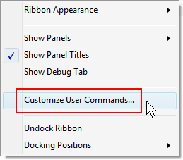 리본 막대에서 마우스 오른쪽 버튼을 클릭하고 사용자 명령 사용자화를 선택합니다.