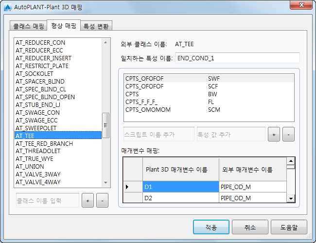 다음은 변환 매핑 지침의 예입니다. 위 창에서 선택한 매핑의 경우 Plant 3D D1 매개변수에는 AutoPLANT PIPE_OD_M을 사용하고, D2에도 동일한 이름을 사용하는 식으로 지정되어 있습니다.