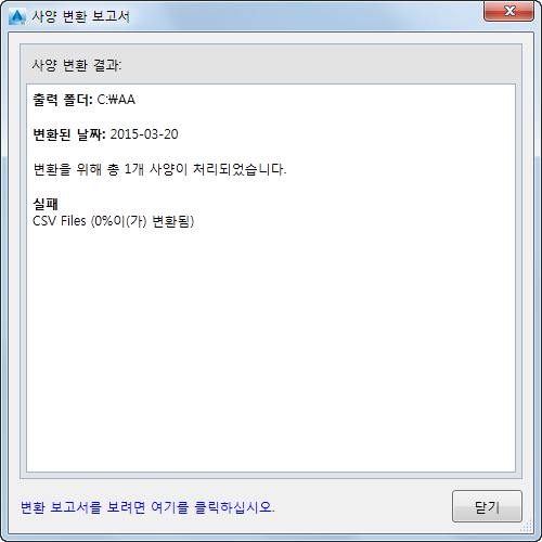 출력 폴더, 변환 날짜, 변환된 사양 또는 카탈로그 수 및 부분적으로 변환된 MDB 파일을 나열합니다.