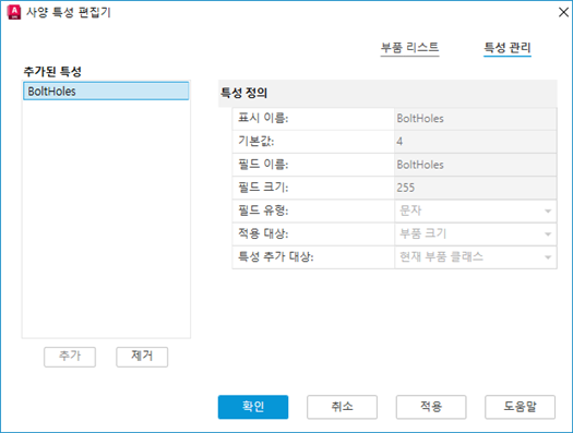 새 특성을 추가하고 현재 선택 항목 또는 선택한 부품 그룹에 대한 특성 정의를 설정합니다.