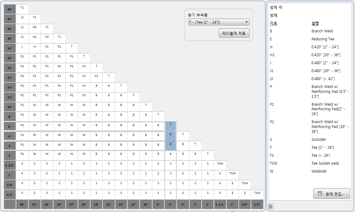 분기 테이블에서 헤더 크기 열과 분기 크기 행이 만나는 셀에 해당 분기에서 사용할 부속품을 식별하는 범례 기호가 표시됩니다. 둘 이상의 범례 기호를 분기 셀에 지정할 수 있습니다. 예를 들어, 리듀싱 티와 Latrolet 둘 다를 동일한 3” x 4” 셀에 지정할 수 있습니다.