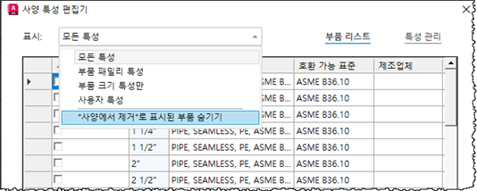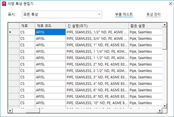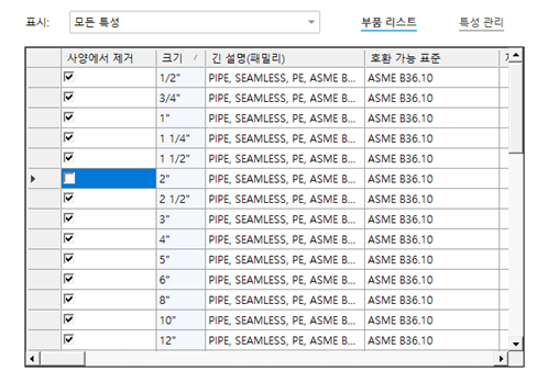 - 사양 편집기의 사양 시트 창에서 부품(예: 파이프, PE, ASME B36.10)을 클릭합니다.