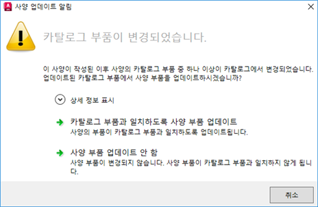 - 작업이 완료되면 사양 업데이트 알림 대화상자가 표시됩니다. 카탈로그 부품과 일치하도록 사양 부품을 업데이트할지 여부를 선택합니다.