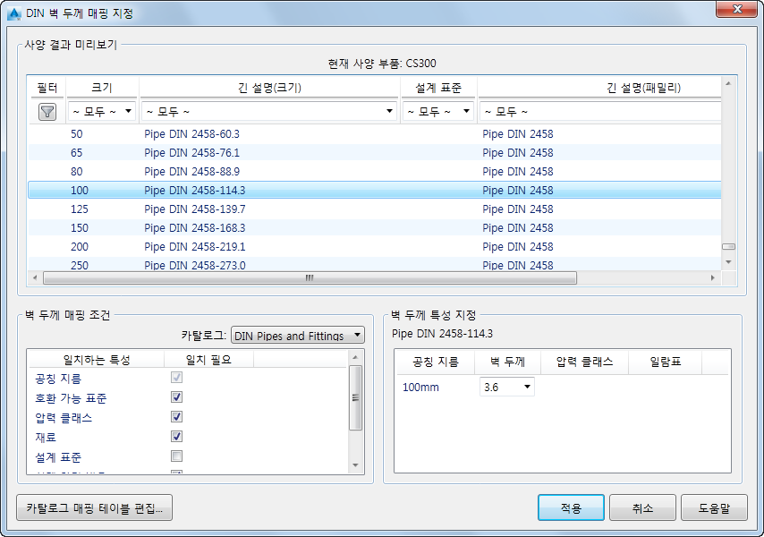 DIN 벽 두께 매핑 테이블 편집 대화상자를 표시합니다. 벽 두께 맵이 카탈로그 함께 저장됩니다.