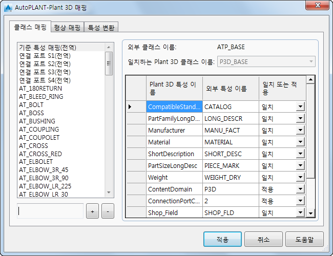 왼쪽 창에서 선택한 클래스의 AutoPLANT 특성에 매핑할 Plant 3D 특성을 지정합니다.