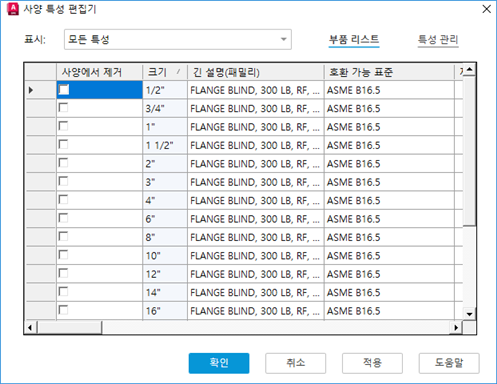 사양 시트에 포함하기 위해 선택한 부품 패밀리 내에서 부품을 편집합니다.