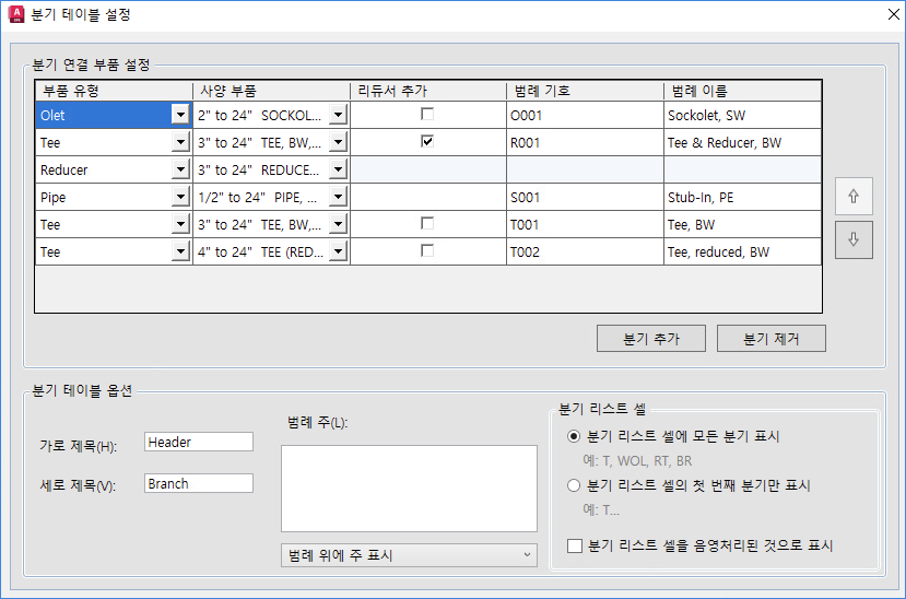 분기 테이블에 사용되는 부속품을 정의합니다. 또한 분기 테이블의 표시 옵션을 설정할 수 있습니다.