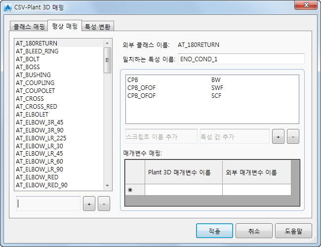 Plant 3D와 타사 간의 매개변수 매핑을 지정합니다. 각 형상 매핑에는 해당하는 매개변수 세트가 있으며, 이러한 매개변수 세트는 쉐이프에 따라 달라질 수 있습니다.
