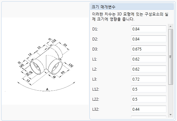 아래의 그림에서는 카탈로그 편집기(크기 탭)에 표시된 Plant 3D 스레드 암 티를 보여 줍니다.
