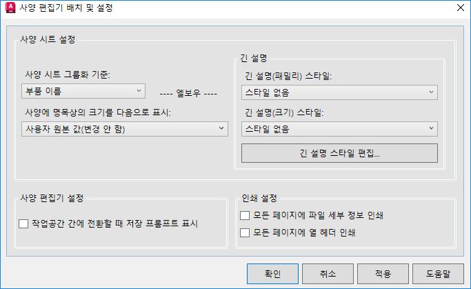 사양 편집기 작업공간 배치를 위한 기본 설정을 지정합니다.