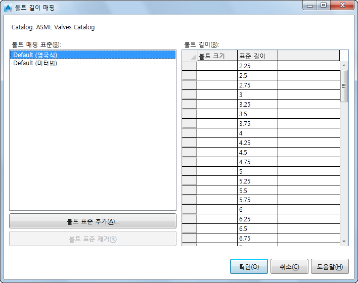 특정 볼트 크기에 대한 볼트 길이 범위 및 증분을 설정할 수 있습니다. 설정은 명명된 표준으로 저장됩니다. 기본(이름 없는) 범위 및 증분을 설정할 수도 있습니다.