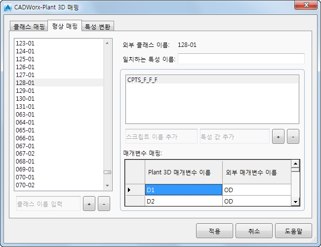 필요한 경우 다양한 컨텍스트에서 Plant 3D 그래픽 스크립트와 일치시킬 CADWorx 특성 이름을 지정합니다.