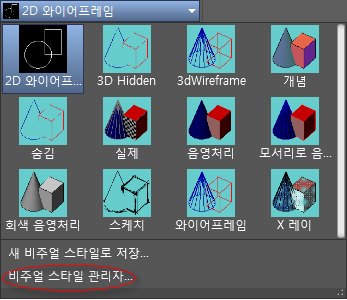 비주얼 스타일 관리자 팔레트에서 도면에서 사용 가능한 비주얼 스타일