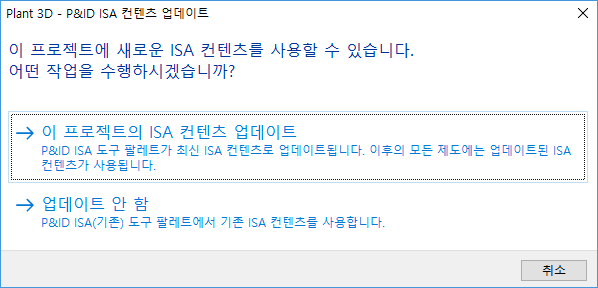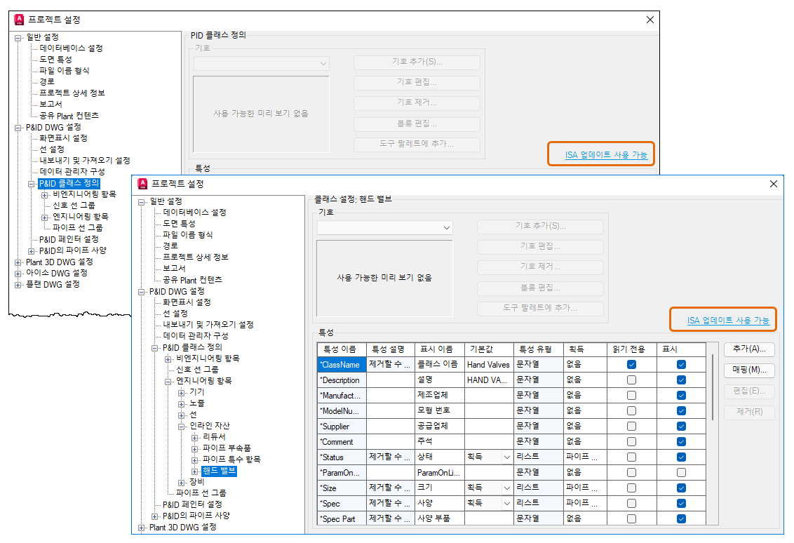 또한 기존 ISA 프로젝트를 열 때 유효성을 확인하기 위한 마이그레이션 검사가 구현되었습니다. 이전 버전에서 작성된 ISA 프로젝트를 열면 P&ID 클래스 정의 노드 및 각 하위 페이지에 "ISA 업데이트 가능" 링크가 표시됩니다. 이 링크를 클릭하면 Plant 3D - P&ID ISA 컨텐츠 업데이트 대화상자가 열립니다.