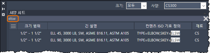 현재 열에 표시되지 않는 경우에도 특성을 검색할 수 있습니다. 검색 결과 위에 마우스 커서를 놓으면 툴팁이 표시되어 어떤 특성에 검색 문자가 포함되어 있는지를 보여줍니다. 예를 들어, 검색 상자에 "elsw"를 입력하면 Skey=ELSW인 모든 엘보가 검색 결과에 표시됩니다.