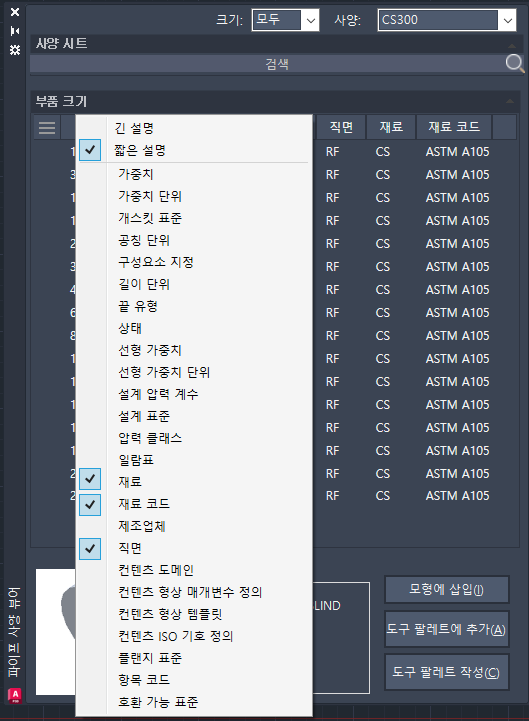 사양 시트 및 부품 크기의 왼쪽 상단에 모두 열 사용자화 기능이 추가되었습니다. 버튼을 클릭하여 특성 리스트를 표시합니다. 이 리스트에서 열에 표시할 특정 특성을 선택할 수 있습니다. 각 열을 끌어 해당 열의 위치를 수동으로 조정할 수도 있습니다.