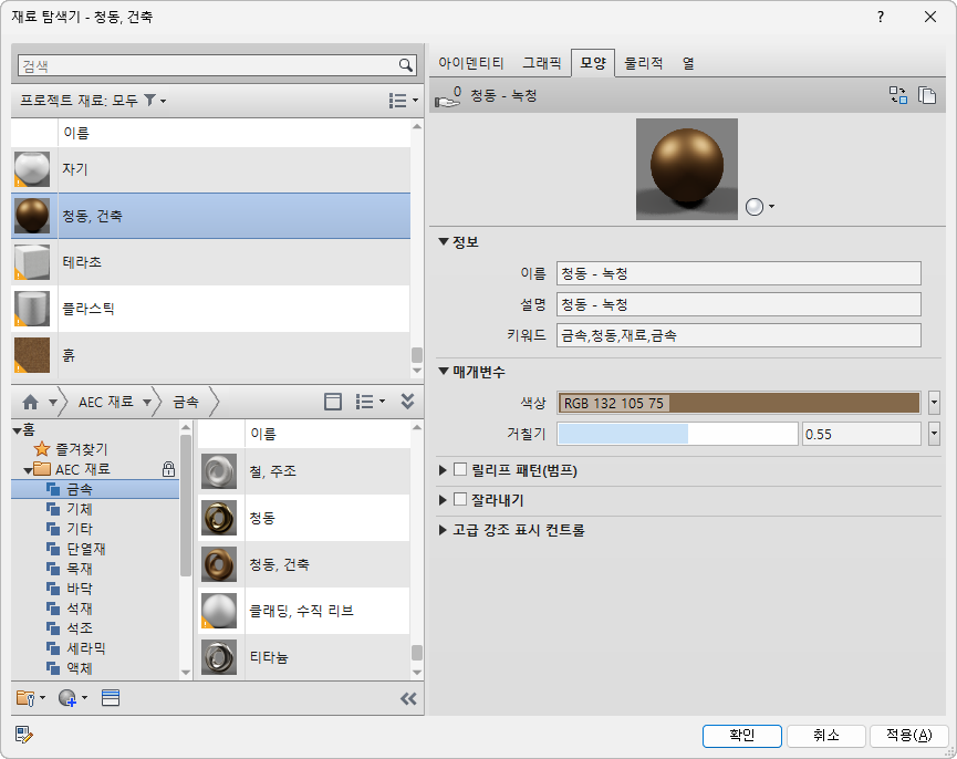 재료 탐색기 대화상자를 사용하여 요소에 대한 재료를 찾고 관리할 수 있습니다.