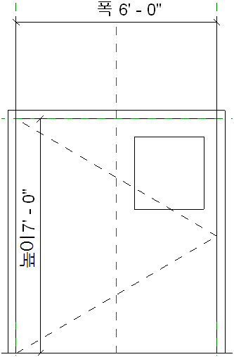 이 예에서 창은 문의 중앙선과, 문 패널의 오른쪽으로 구속되며 두 군데 모두 참조 평면을 통해 나타납니다. 참조 평면에 대해서는 창의 위치가 고정되어 있습니다.