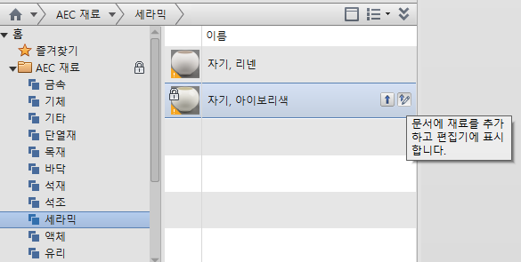 버튼을 클릭합니다. 이 버튼을 클릭하면 라이브러리의 재료가 프로젝트 재료 리스트에 추가됩니다.