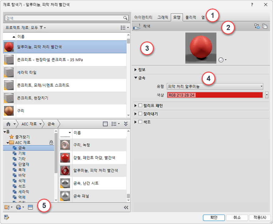 | 4 | 특성 패널: 선택한 렌더링 모양 맵소스의 세부 특성을 표시 및 관리합니다. 에셋 이름 및 설명은 정보 드롭다운 패널 아래에 표시됩니다. 위의 이 예에서는 "피막 처리 - 빨강" 모양 렌더링 모양 맵소스에 대해 표시(확장)되는 금속 특성을 보여줍니다. 예를 들면, 액체에 대해 표시된 특성 세트는 금속에 대해 표시된 특성 세트와 다릅니다. |