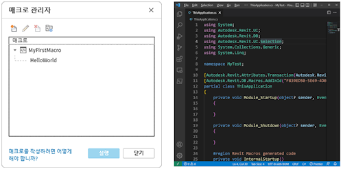 이러한 API 확장 기능 외에도 API를 사용하여 Revit에서 실행되는 매크로를 정의할 수 있습니다. API 차이점에 대해서는 이 항목의 뒷부분에서 설명합니다. 그러나 경험이 많은 개발자라면 Revit.ini에 매크로를 등록하거나 RevitAPI.dll을 참조로 추가할 필요가 없다는 것을 알아 두십시오.