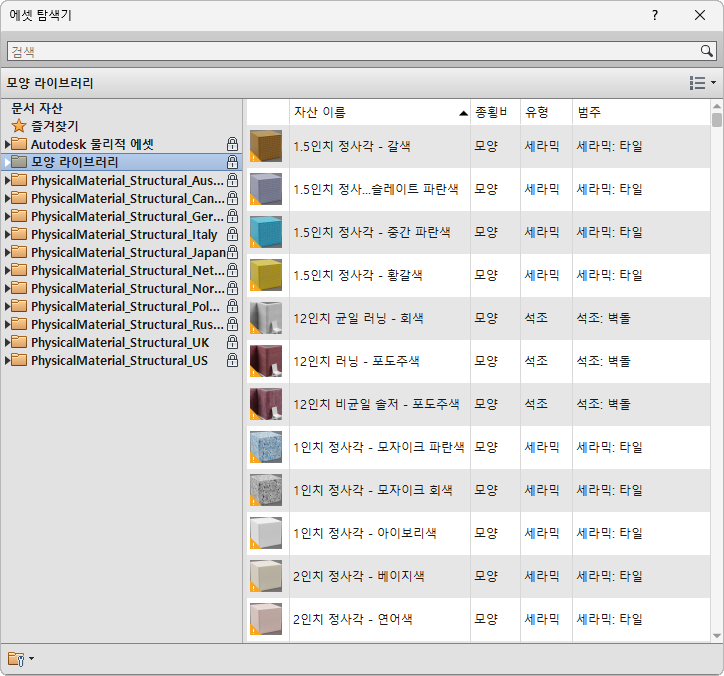 애셋은 Revit 프로젝트 또는 라이브러리에 저장됩니다. Revit 프로젝트에만 있고 어떤 재료에도 참조되지 않은 에셋은 참조되지 않은 에셋 라이브러리에 저장됩니다. 필요에 따라 Revit 세션 동안 참조되지 않은 에셋을 작성 및 편집할 수 있습니다. 그러나 세션 동안 작성하거나 편집한 참조되지 않은 에셋을 저장하려면 Revit 프로젝트를 저장해야 합니다.