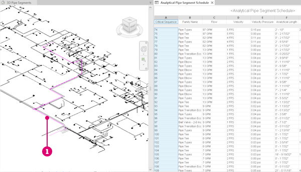 일람표에서 요소를 선택하면 현재 열려 있는 모든 뷰에서 해당 요소가 선택됩니다. 해석 파이프 세그먼트만 표시하려면 가시성\그래픽 재지정 설정에서 파이프 요소 모델 카테고리를 끄면 됩니다.