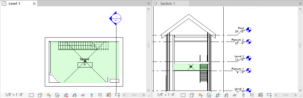 팁: 입면도를 작성하여 레벨을 작성할 수 있지만 공간은 입면도에 표시되지 않습니다.
