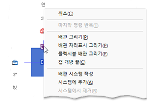 상황별 메뉴에서 추가: 장비 또는 설비 패밀리의 배관 커넥터 위로 마우스 포인터를 이동하고 마우스 오른쪽 버튼을 클릭하여 상황별 메뉴를 표시합니다. 배관 그리기를 클릭하여 배관을 추가하고 커넥터에서 크기 및 입면을 상속합니다. 배관은 커넥터와 동일한 시스템 분류에 지정된 시스템 유형을 사용합니다. 이 방법은 입면도 또는 단면도에서도 사용할 수 있습니다.