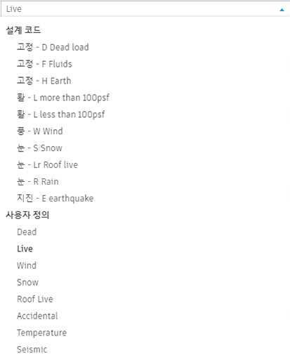 주: 수동으로 추가한 하중 특성을 편집하거나 제거할 수 있습니다. 선택한 설계 코드에서 제공하는 하중 특성은 편집하거나 제거할 수 없습니다. 이는 다른 설계 코드 선택에 의해서만 업데이트됩니다.