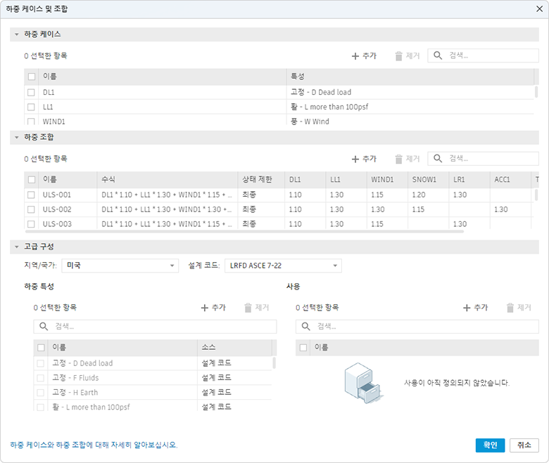 하중 케이스 및 조합 대화상자를 사용하여 하중 케이스를 추가, 편집 또는 제거합니다.