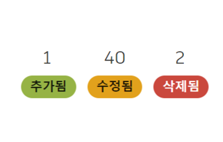 팔레트에는 추가, 수정 또는 삭제된 객체에 대한 개요가 표시되며 모델에서도 강조 표시됩니다. 표시하지 않으려는 카테고리를 선택 해제하여 추가, 수정 또는 삭제된 객체만 표시하도록 카테고리를 필터링할 수 있습니다.