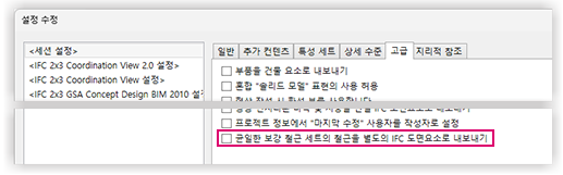 이 옵션을 사용하여 균일한 보강 철근 세트의 철근을 별도의 IFC 도면요소로 내보냅니다.